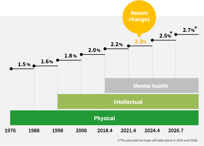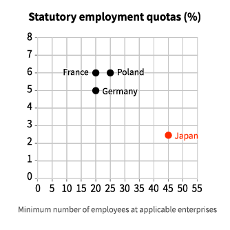 In Japan, the law determines the employment quota for persons with disabilities. For private enterprises, the quota was raised from 2.2% to 2.3% in March 2021, and a further increase to 2.7% is planned in 2026. Japan's quota is low compared to other countries with statutory employment quotas. Although differences in quota conditions and requirements makes a simple comparison difficult - it is clear that Japan lags behind other nations.
