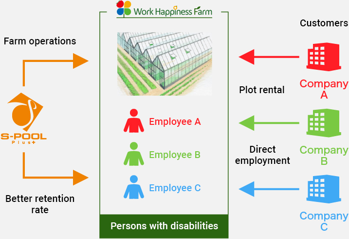 A farm is rented out on a per plot basis to several companies and approximately 100 persons with disabilities work there. The model where multiple corporations sharing farms stabilizes income since it is based on repeat business and not dependent on specific customers.