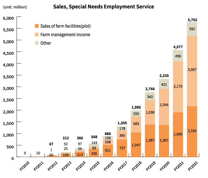 Our income derives from three main sources: stock-based farm management fees with continuous monthly contracts, flow-based income from recruitment fees, and sales of cultivation equipment at the time of initial contract. Stock-based farm management fees accrue income as the contracts increase over time. This income was a major contributing growth factor in FY2018 (ended November 2018) and is a foundation for future stable growth. The philosophy of our Special Needs Employment Service, which provides employment services for persons with disabilities, is to contribute to a better society by creating employment for as many persons with disabilities as possible. We have a numerical target of 5,300 employees for FY2025 and we are aiming for further business expansion and social contribution.