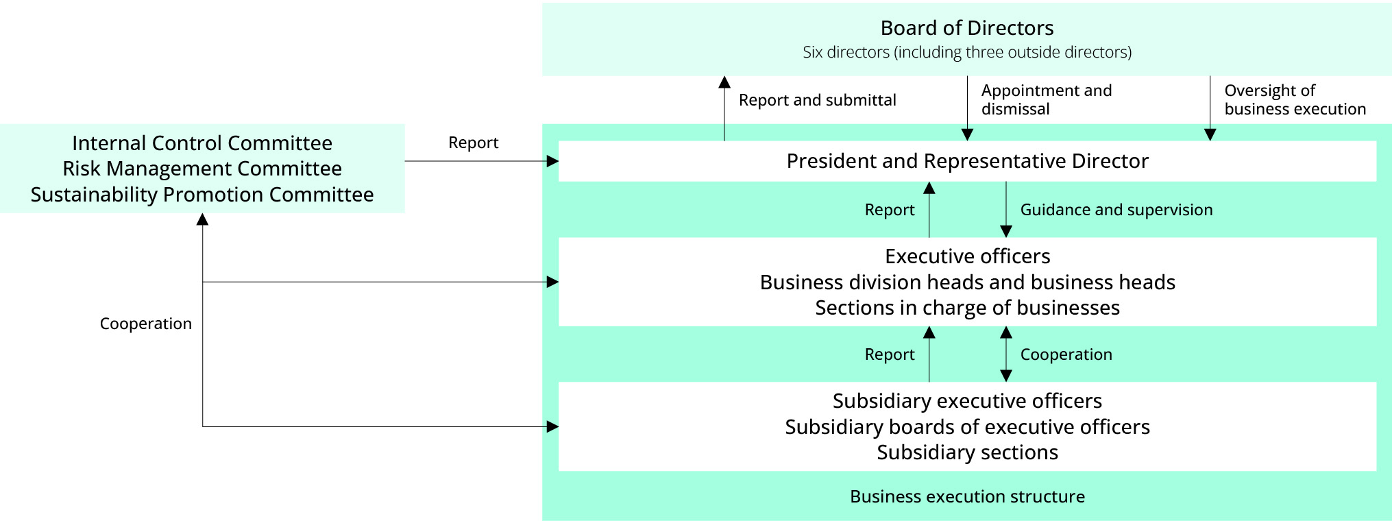 To contribute to the sustainable development of society and enhance medium- to long-term corporate value, we have established the Sustainability Promotion Committee, chaired by the director in charge of the President’s Office. The committee, which convenes semiannually, deliberates on sustainability-related initiatives such as corporate branding, environmental measures including climate change issues, social contribution, and employee engagement. Activities of the committee are appropriately overseen by the Board of Directors, and the results of its deliberations are reported and submitted to the Board.